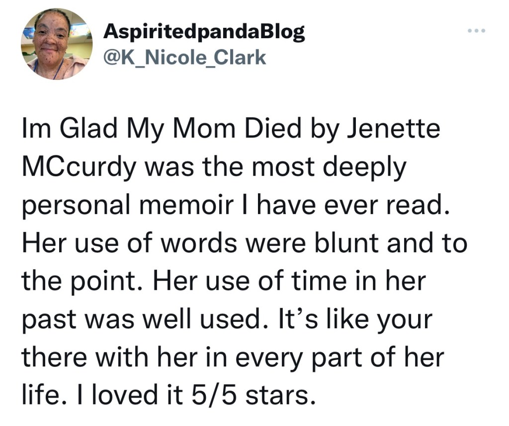 I am so happy to be writing this review on Jennette MCcurdy’s I’m Glad My Mom Died. I remember being younger and watching her first on Icarly. She played Sam Puckeet and she was this bad ass chick that didn’t take crap from anyone. She was just a girl I wished I knew growing up. Then I saw her on Netflix’s Between. Since season two ended I never knew what had happened to her. She was just one of those actors that was different, but like my mama said ” You may see a person happy and living life. You just never know what a person’s life is behind closed doors.”